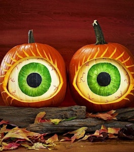 Want a pair of eyes on your front porch to keep watch? Look no further! These “Eye See You” pumpkins will cause a stir! This project requires two white pumpkins for the eyeballs and two slightly larger orange pumpkins. Gather these tools to create this jaw dropper: a carving knife and spoon for hollowing, linoleum cutter, pen or pencil, diluted green and black acrylic paints, and permanent red marker.