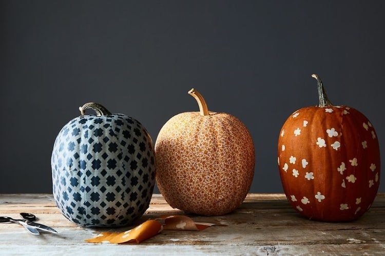 If you want to avoid the pumpkin guts “ick” factor, and to decorate with something less messy than paint, think about fabric scraps, bead or gems, lace and ribbons. Consider this way of embellishment as thinking outside the pumpkin. Use sturdy glue or a hot glue gun and notions to dress your pumpkin and bring flair to your doorstep.